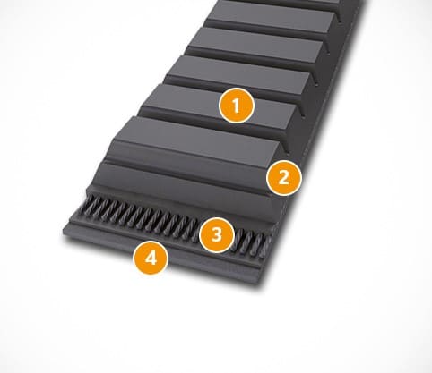 Oviti klinasti jermeni za velike obremenitve z nateznim elementom z nizkim raztezkom in napredno zmesjo za vrhunski prenos moči pri največjih obremenitvah; skladni z DIN 2215/DIN 7753.